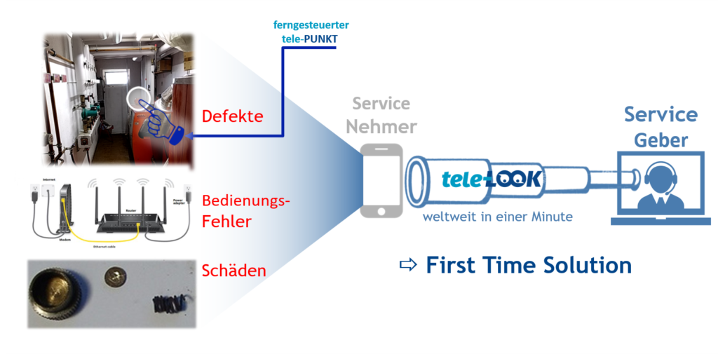 Die Funktionsweise ist simpel: Der Kundendienst-Techniker übermittelt dem Ansprechpartner vor Ort einen Direktlink per SMS. Mit einem Knopfdruck wird via Browser auf dem Mobilgerät die tele-LOOK Webanwendung gestartet und eine audio-visuelle Verbindung mit dem Kundendienst-Techniker aufgebaut. Die integrierte Kamerafunktion des Mobilgerätes überträgt das Bild des Einsatzortes als Live-Stream simultan auf das Display von Service-Nehmer und Service-Geber, was dem Techniker ermöglicht, den Ansprechpartner am Einsatzort Schritt-für-Schritt durch den Diagnose- und Wiederherstellungsprozess zu führen. Ein sogenannter tele-Punkt auf dem Display, den der Techniker vom PC aus fernsteuert, zeigt dem Nutzer wie ein Zeigefinger, was er auf den Bedienelementen der Maschine zu tun hat oder was in welcher Reihenfolge zu prüfen ist. Verständigungsprobleme bei der Fehlerdiagnose und daraus resultierende unnötige Prüfschritte treten so erst gar nicht auf. Auch die Dokumentation für den Einsatzbericht übernimmt das Tool automatisch: auf Knopfdruck löst der Kundendienst-Techniker in der Anwendung Snapshots der wichtigsten Ansichten und Messwerte aus, die DSGVO-konform im deutschen Rechenzentrum in der Cloud abgelegt werden. Nach der digitalen Kundendienst-Session wird aus den gespeicherten Bildern, den relevanten Stammdaten und optionalen Bemerkungen ein PDF-Protokoll erzeugt und per E-Mail an alle prozessbeteiligten Personen übermittelt.